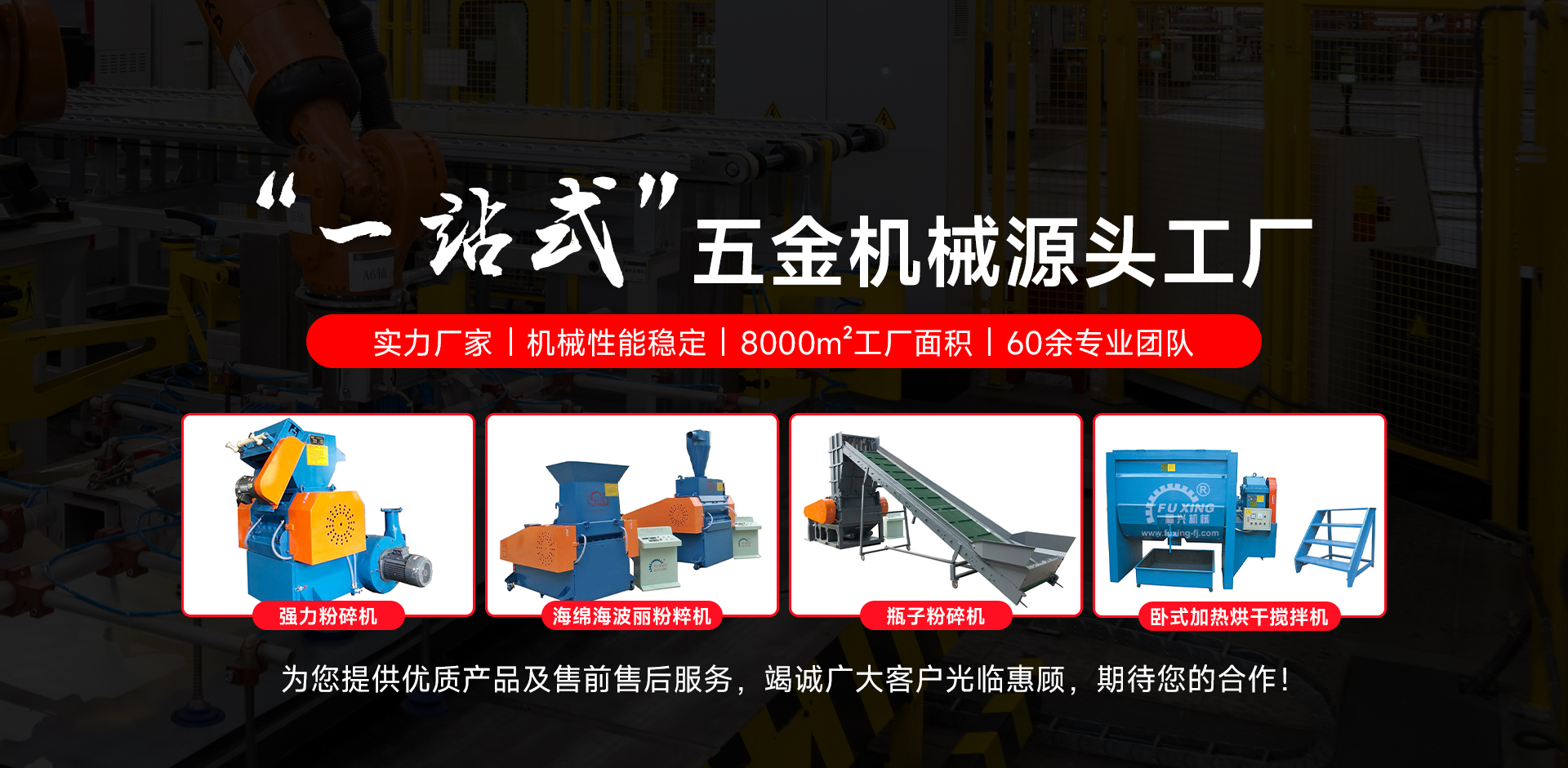 南安市發(fā)臺(tái)機(jī)械制造有限公司是一家從事五金機(jī)械行業(yè)有著三十幾年經(jīng)驗(yàn)的大型企業(yè),無論是產(chǎn)品設(shè)計(jì)、開發(fā)、制造都有著豐富的經(jīng)驗(yàn);于2004年在大陸設(shè)廠——南安市福興塑料機(jī)械制造廠。專業(yè)生產(chǎn)塑膠周邊設(shè)備:超大型強(qiáng)力粉碎機(jī)、超大型 臥式攪拌烘干機(jī)、混色機(jī)、螺旋輸送機(jī)、切粒機(jī)、油壓切斷機(jī)、磨刀機(jī)、薄膜耳料回收機(jī)、注塑水口料回收機(jī)、注塑機(jī)邊粉碎機(jī)、押出造粒機(jī)等等。